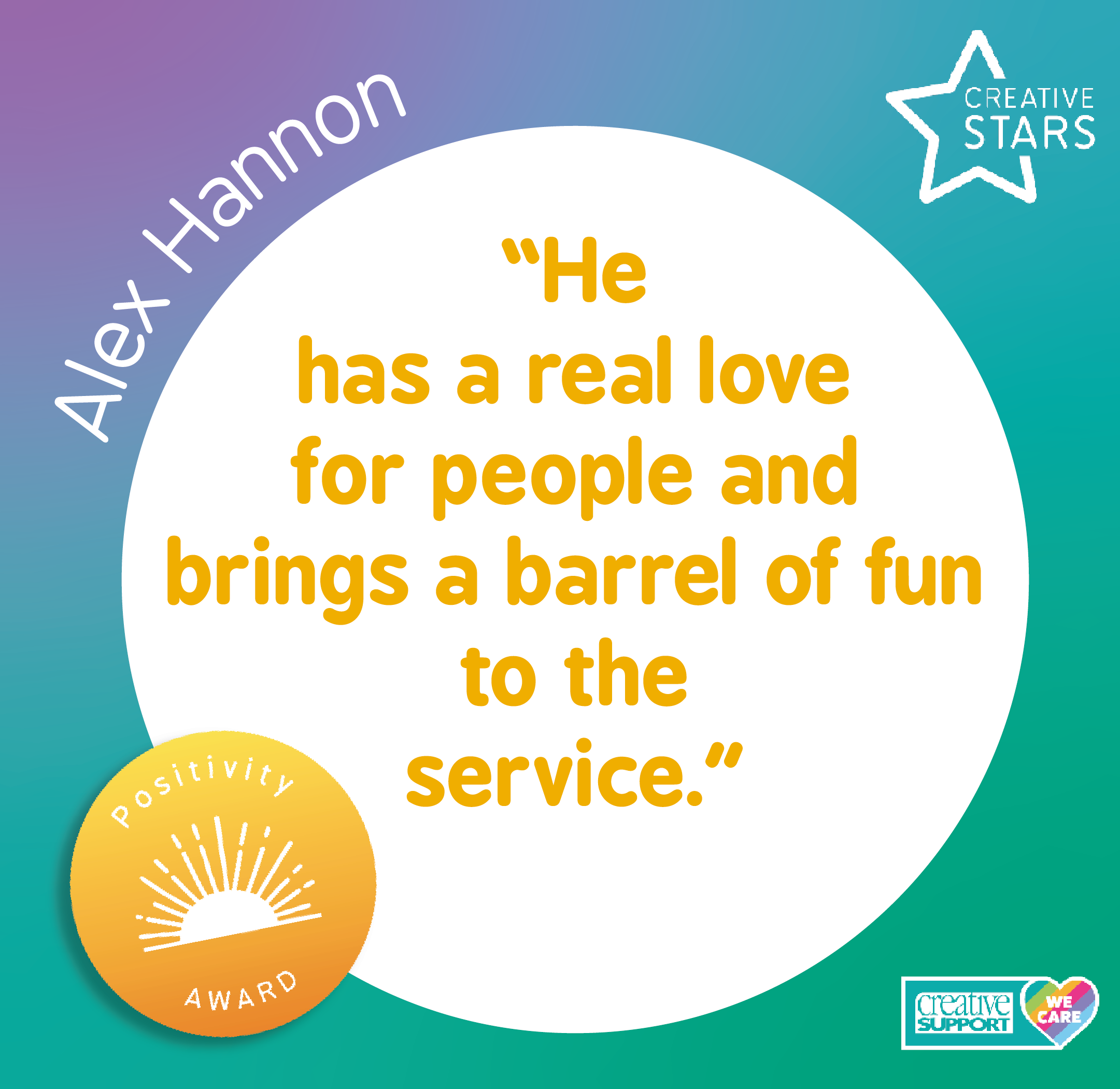 He consistently gives 100% to any task and actively gets involved in daily activities. Alex has built new friendships and recently joined a weekly community group, where he enjoys cooking and learning new skills. Alex’s caring nature, positive attitude and wonderful sense of humour bring fun and warmth to those around him every day.