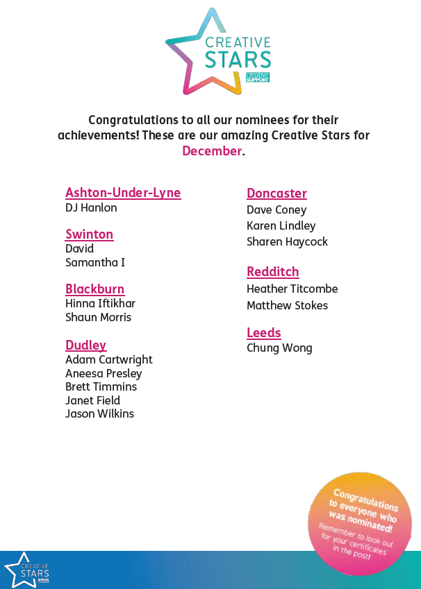 If you’re interested in hosting a judging panel, get in touch by emailing creative.stars@creativesupport.co.uk or by giving us a ring on 0161 236 0829.