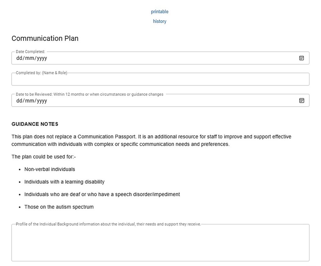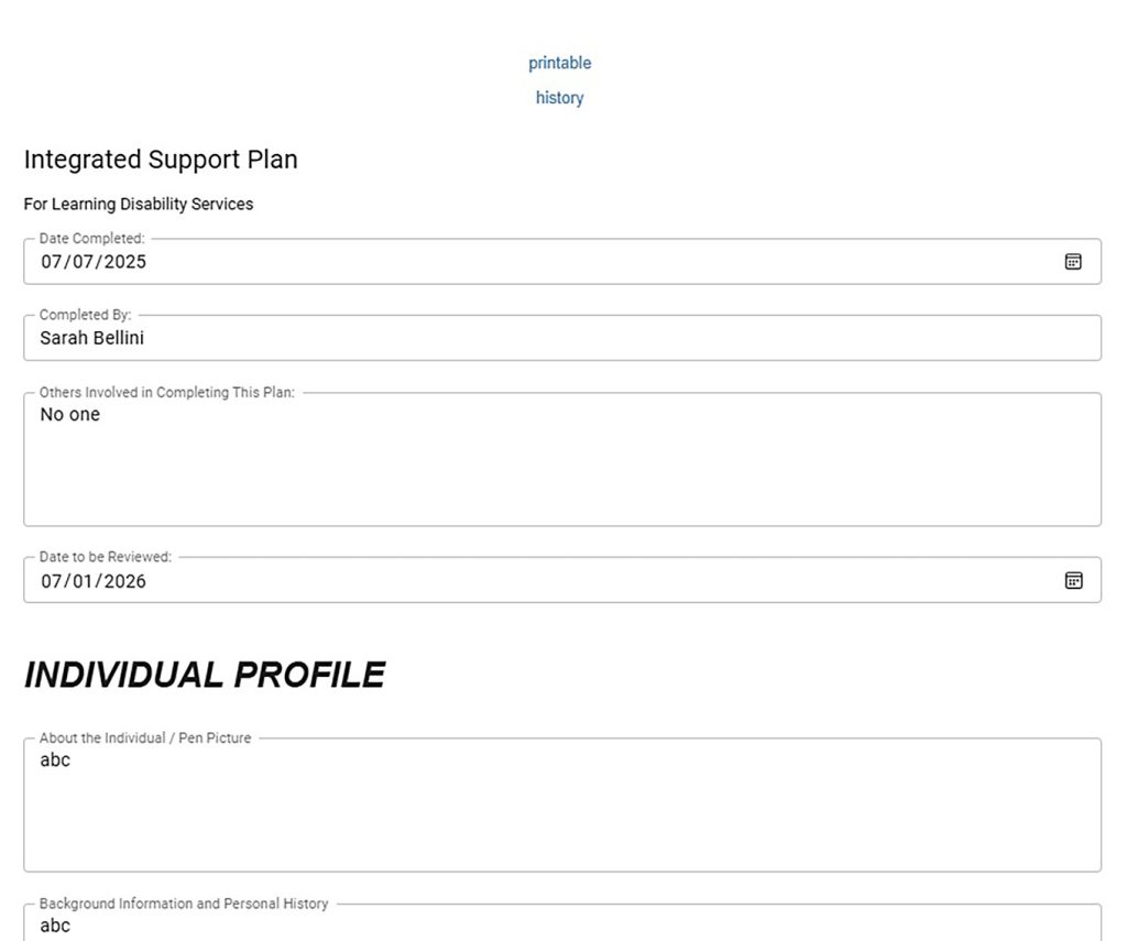 This first image is how the profile might look for an individual with a Learning Disability. Below you’ll also see some examples of the forms listed, one from each section.