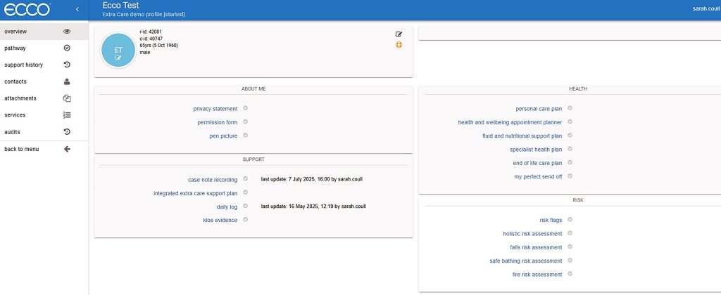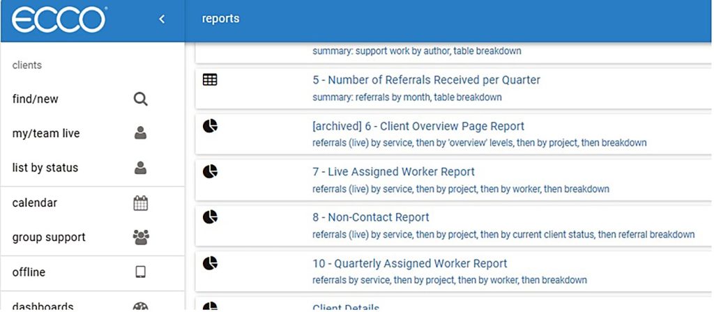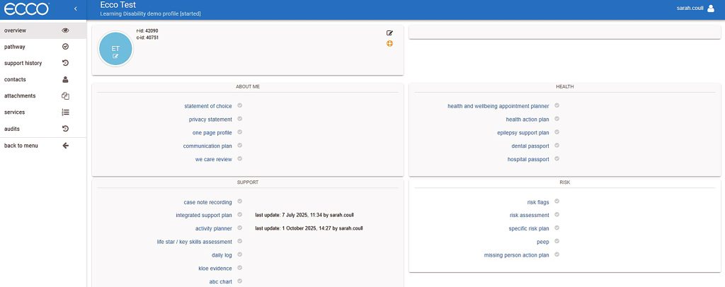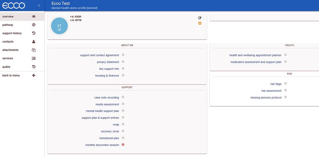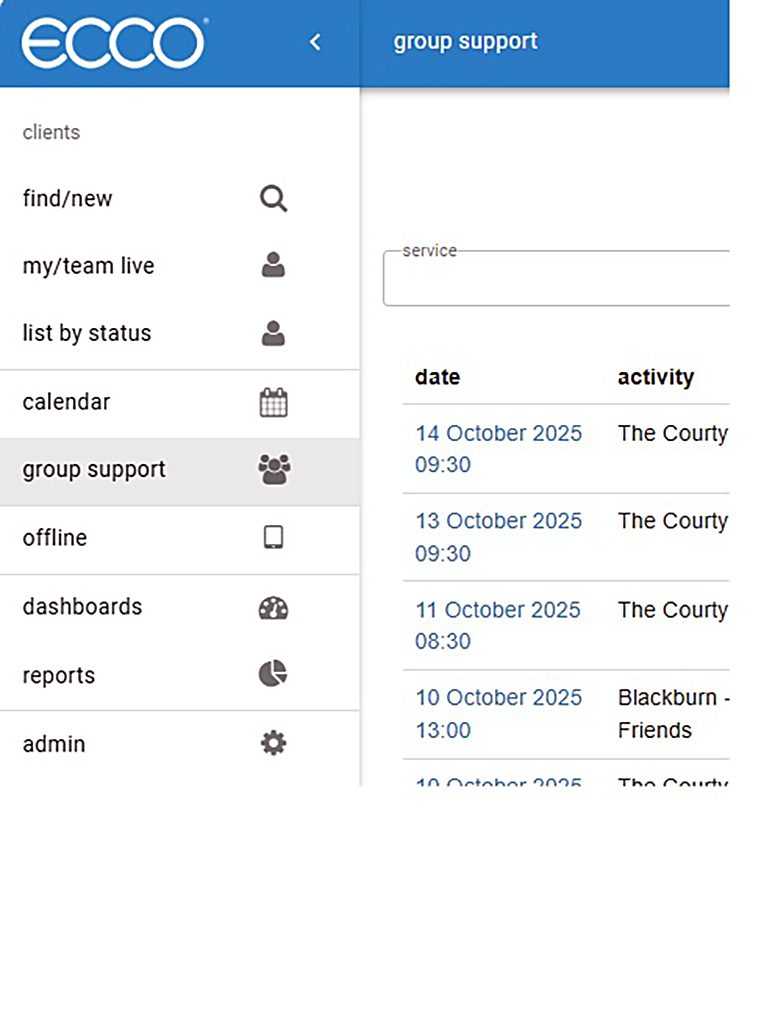 ECCO is an online recording system used to capture essential information about the people we support and to capture support notes, contact entries and attachments. Of course, there is no ‘one size fits all’ client profile. This brochure is designed by the Online Systems Team to help you build your ECCO profiles to fit the needs of your service; it shows an example of what each profile looks like, examples of forms per service type (see relevant tabs) and an index of all current forms available.