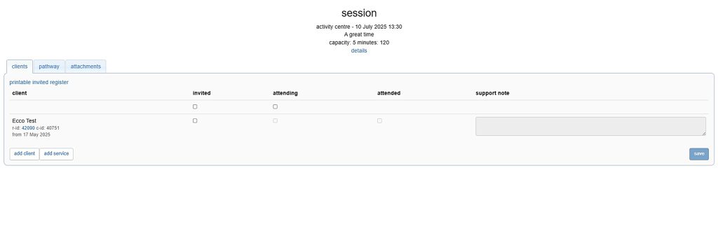 To invite attendees click into the date and time link. This pulls up a list of clients and checkboxes that you can tick to say invited/attended