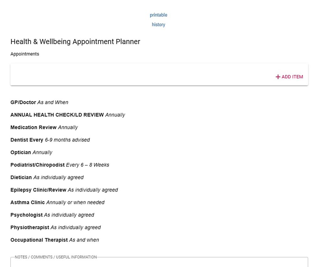 - Regularity of visits for: GP/Doctor, Annual Health Check/LD Review, Dentist, Optician, Podiatrist/ Chiropodist, Dietician, Epilepsy Clinic/Review, Asthma Clinic, Psychologist, Physiotherapist, Occupational Therapist