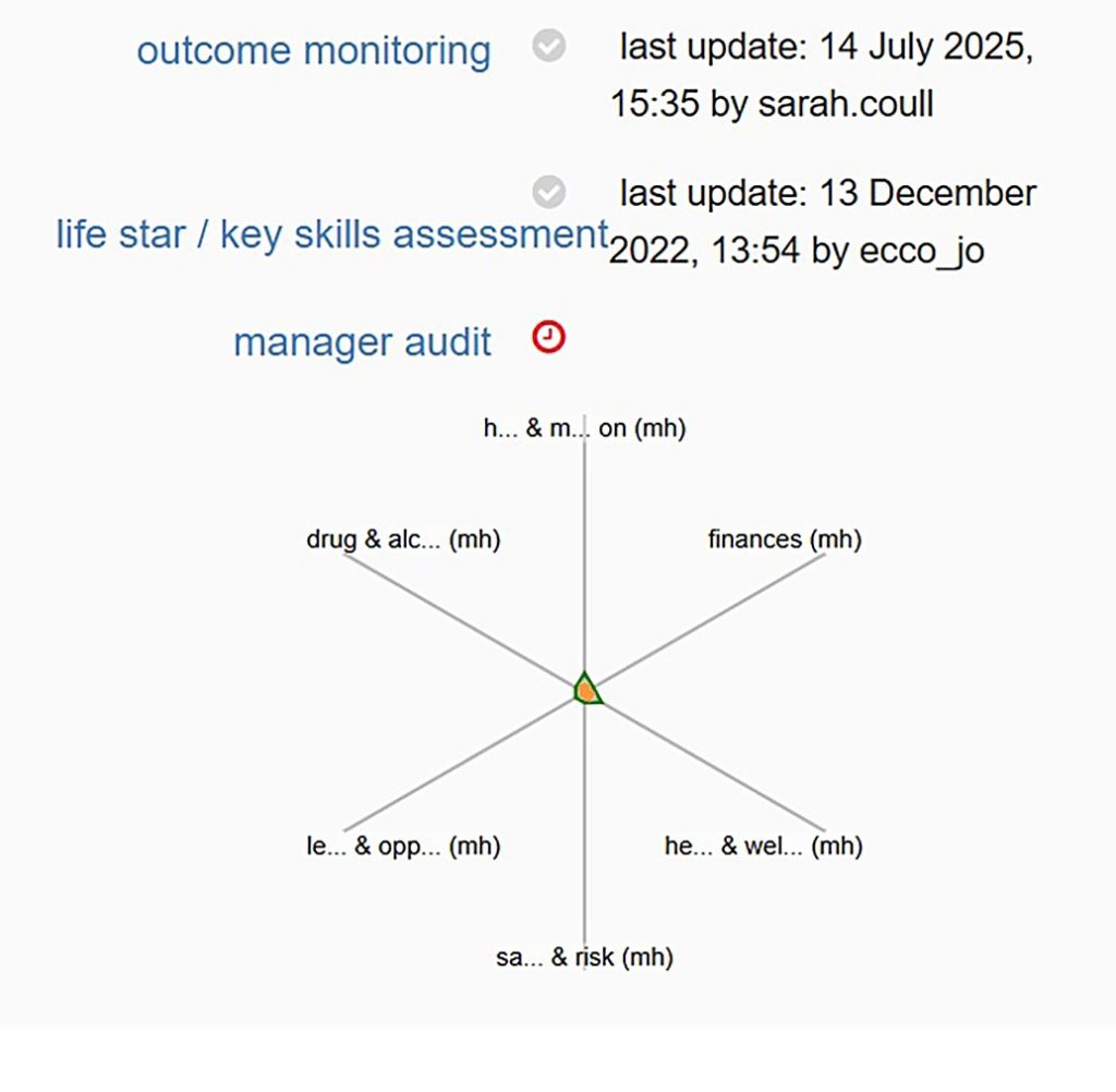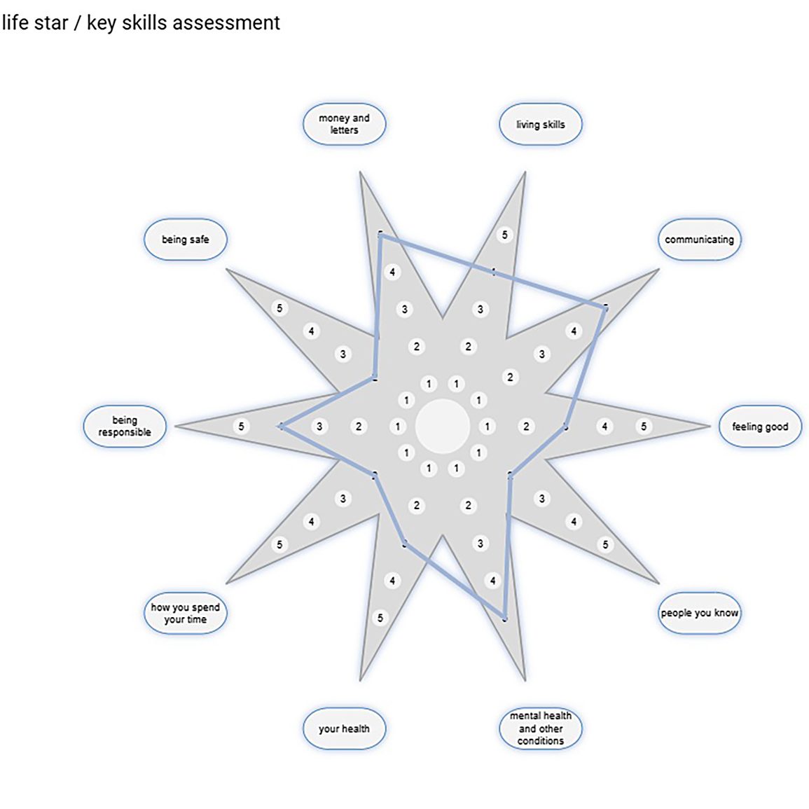 When the needs assessment has been completed, this will show a star chart to identify where the support needs sit within the outcome areas (indicated with a green line). The total size of the green area represents the overall level of need for that client, and the shape indicates where the greatest balance of need lies for that client: