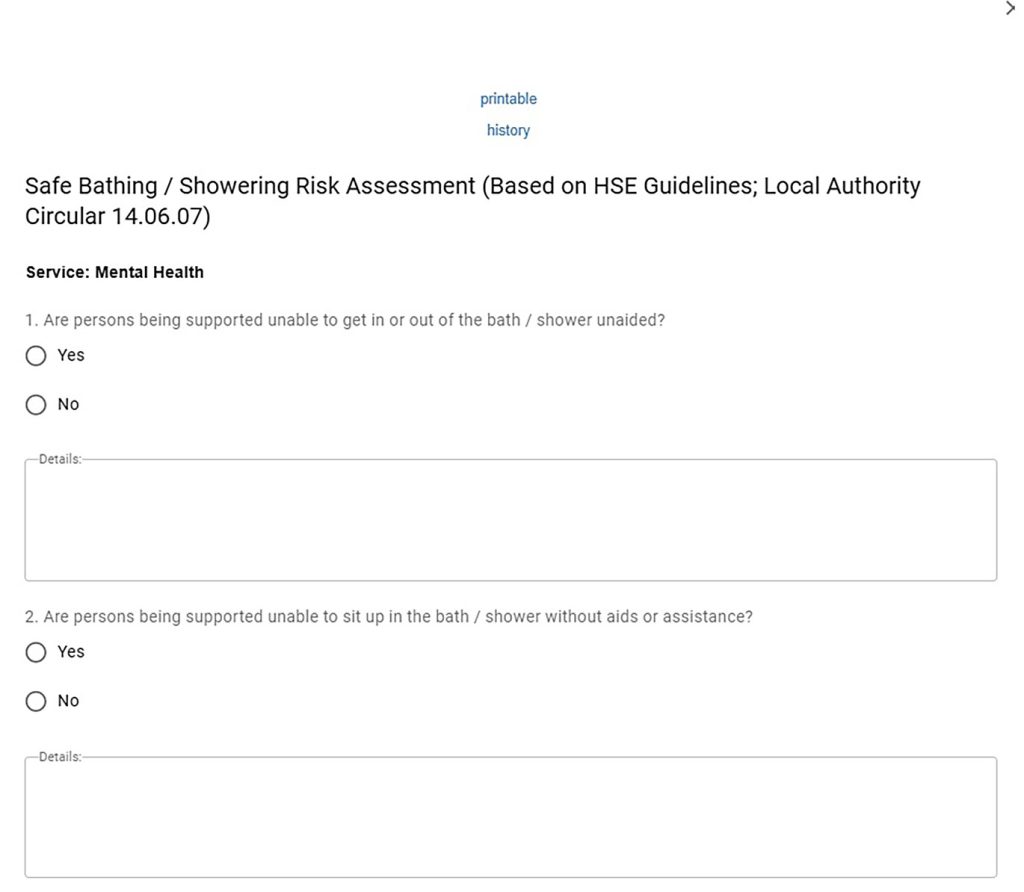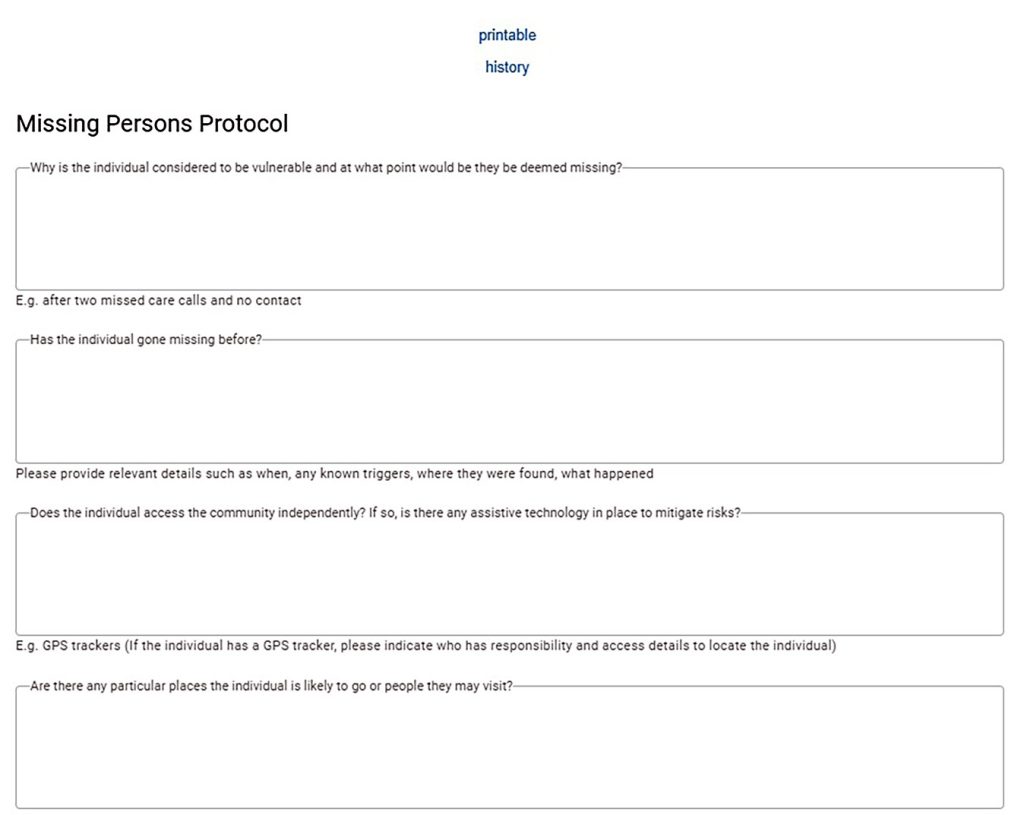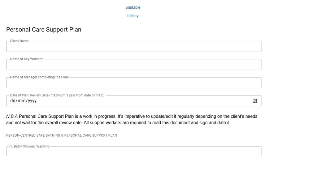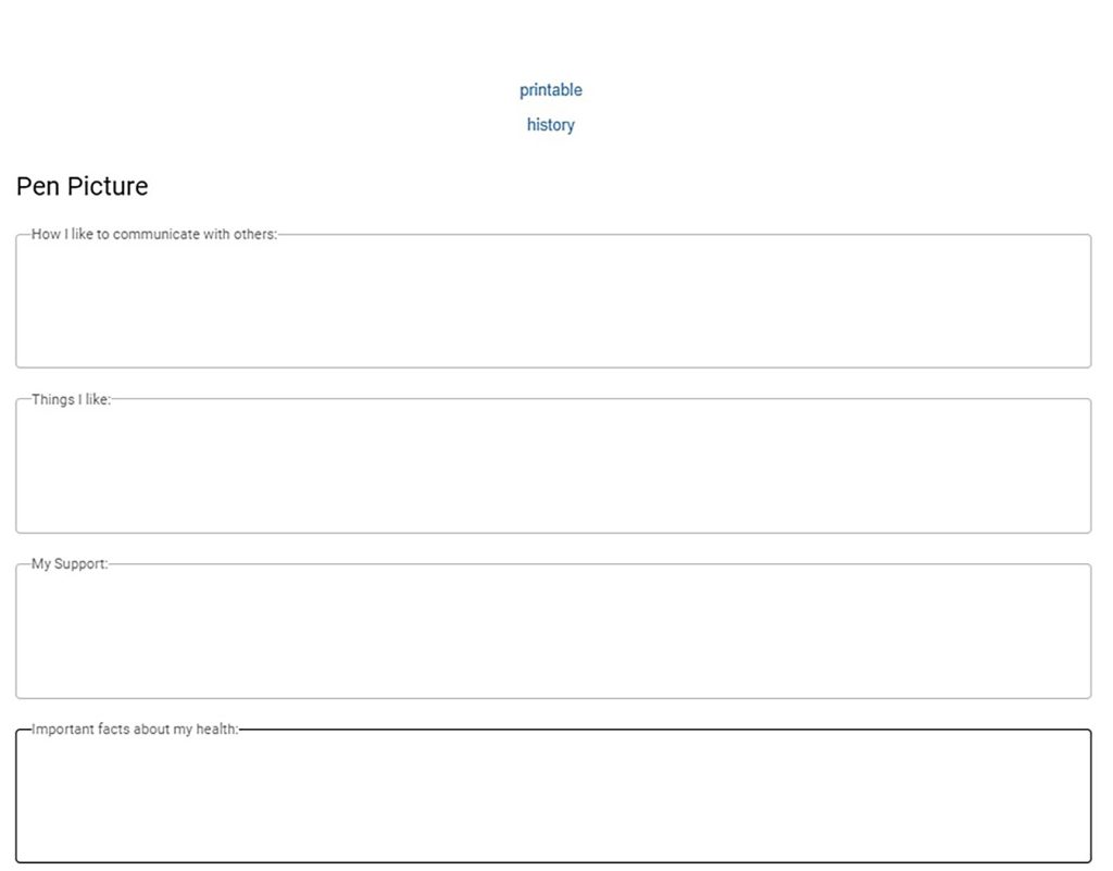 Custom forms are usually created from documents that used to be paper-based, as they are more printer friendly than questionnaires. They can also include imagery and different text styles e.g. bold or large text. The created custom form is ‘sticky’ and stays on screen unless you ‘clear form’. There is a ‘version history’ recorded (so you can look back at previous versions) but it is usually designed as a form that is completed once for a client and then just reviewed from then on (e.g. hospital passport, medication support plan). Custom forms create a PDF version for printing and for sharing with others, such as emailing to a social worker.