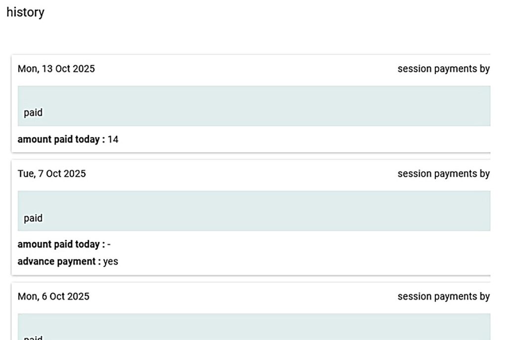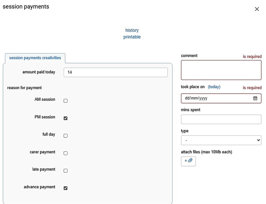 The service wanted to track activities in the group function, and take payment details for each client through their profile. Within each client profile they wanted to know details of the session they attended, what kind of payment and amount. The form is sticky and previous versions can be accessed through the history function.