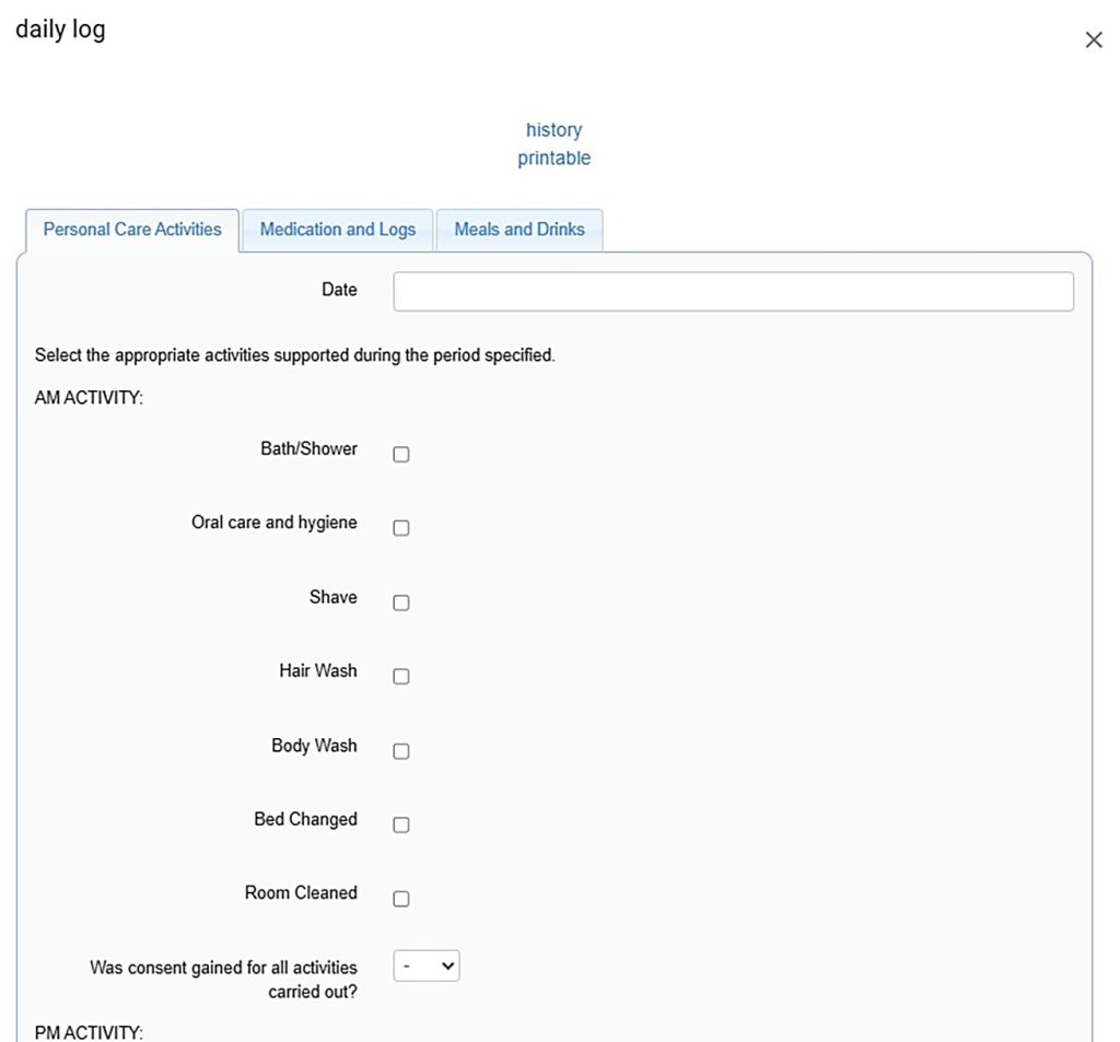 - Personal care activities (AM, PM, comments, when they took place, minutes spent, type of support, attachments)