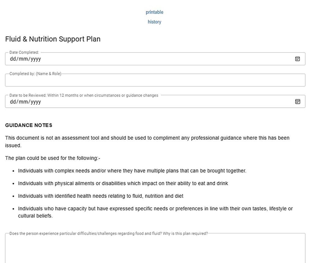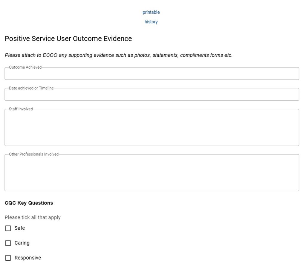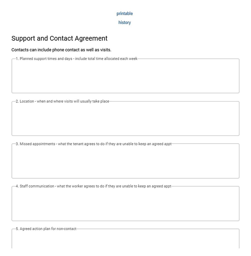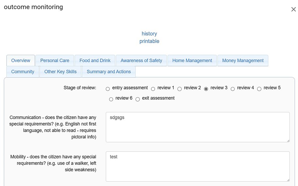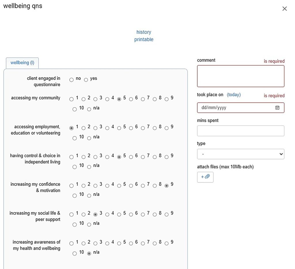 - Marking 1-10 or n/a for different questions e.g ability to live more independently The form is sticky and previous versions can be accessed through the history function.