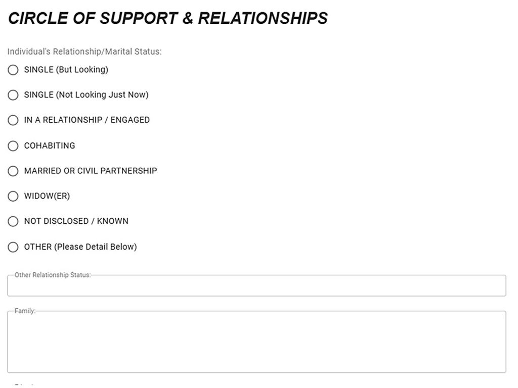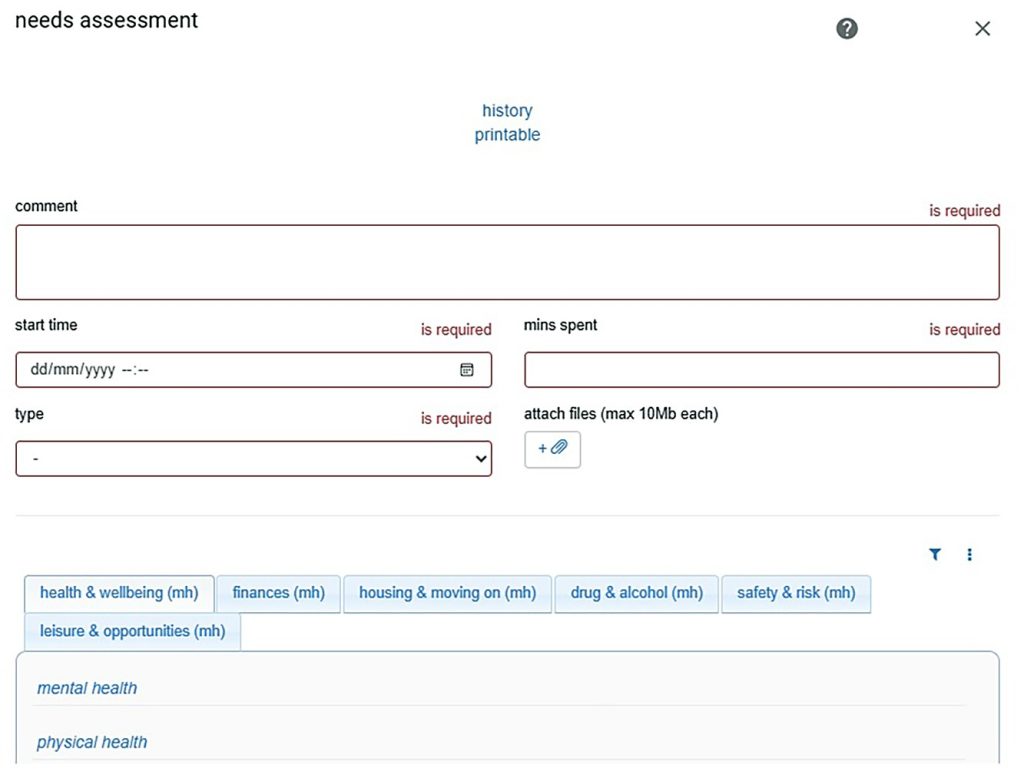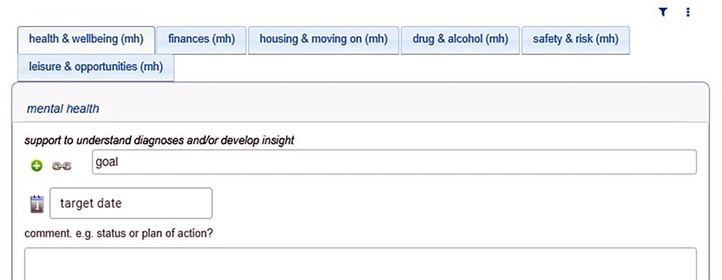 You can navigate through these tabs to find support needs. Under each support need heading, there is a free text box: this is used to capture specific details about individual client’s needs, outcomes, aspirations, agreed support actions, and achievements.