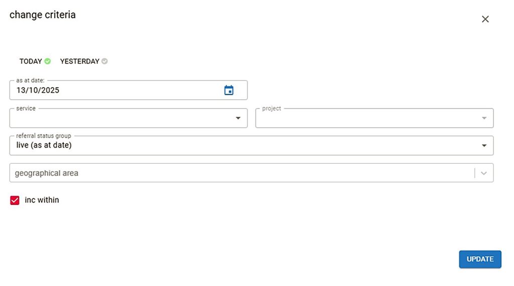 2. Click into search criteria, it will give the option to filter by service as below, select the relevant service from the drop down and click ‘UPDATE’, then the play button.