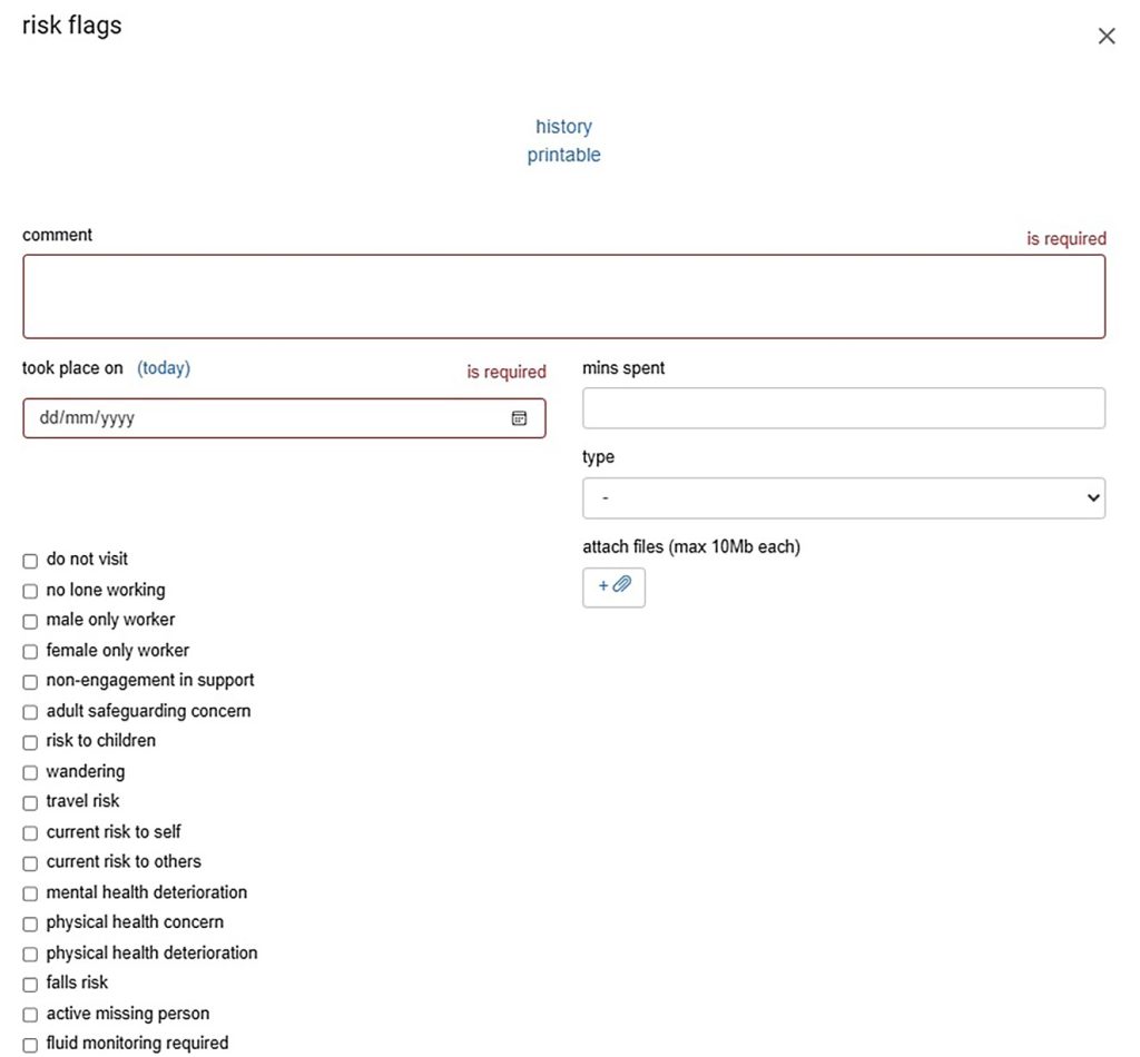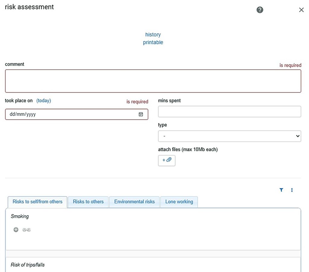 This is where you record the date you completed this piece of work, how long you spent doing it in minutes, and how that support was delivered. These fields are essential as they generate a reportable support history for the client.