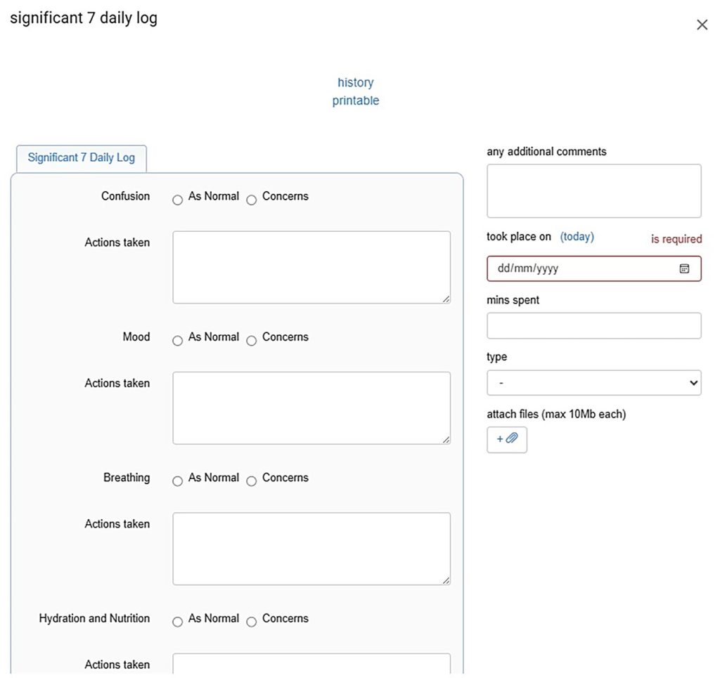 The service wanted to capture key areas for a daily log of information, whether or not it was as normal, or concerns, and any action taken: