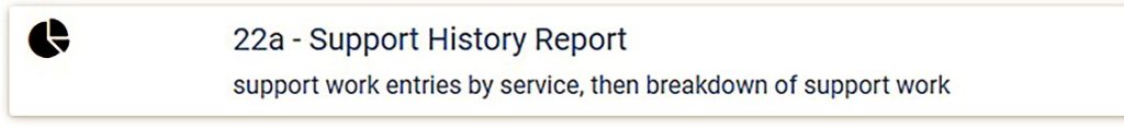 This report allows you to access support work entries by service, and a breakdown of support work including support in minutes between chosen time period.