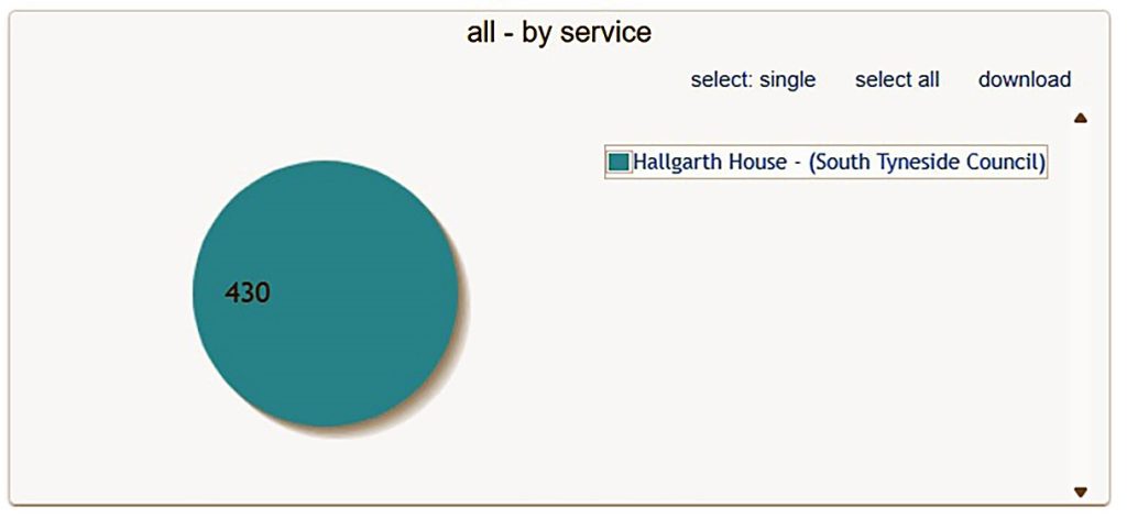 - On the pie chart click ‘select all’ as seen in picture below, which will show a breakdown of support work for that service and time period.